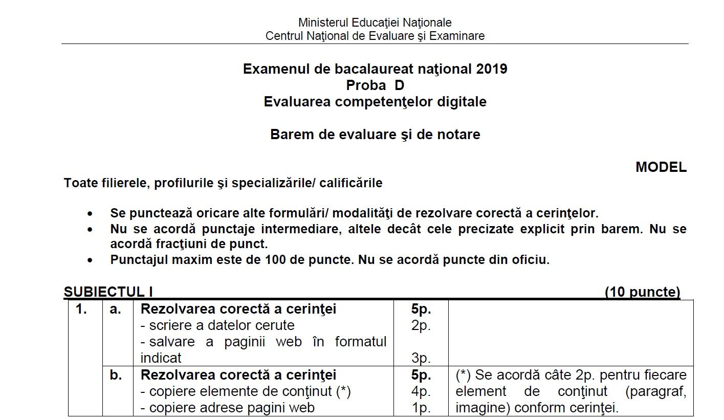 Bacalaureat 2019 Elevii Clasei A Xii A SusÅ£in AstÄzi Proba De Evaluare A CompetenÅ£elor Digitale Vezi Modelele De Subiecte Source from : https://adevarul.ro/educatie/scoala/bacalaureat-2019-elevii-clasei-xii-a-sustin-proba-evaluare-competentelor-digitale-vezi-modelele-subiecte-1_5cfa2c32445219c57e86084d/index.html Conform modelului pentru bacalaureat 2019, candidaţii au de rezolvat două fişe de examen, a şi b, care însumează 3 subiecte, notate cu un punctaj maximum de 100 de puncte. Ele vor fi salvate după fiecare prelucrare, în directorul indicat. Modele de subiecte certificate competențe digitale le poți găsi aici. Proba d, pentru evaluarea competenţelor digitale, are statutul de probă obligatorie în cadrul examenului de bacalaureat, pentru candidaţii de la toate filierele, profilurile şi specializările. Punctajul maxim cumulat pentru cele două fișe date, a şi b este de 100 de puncte.
