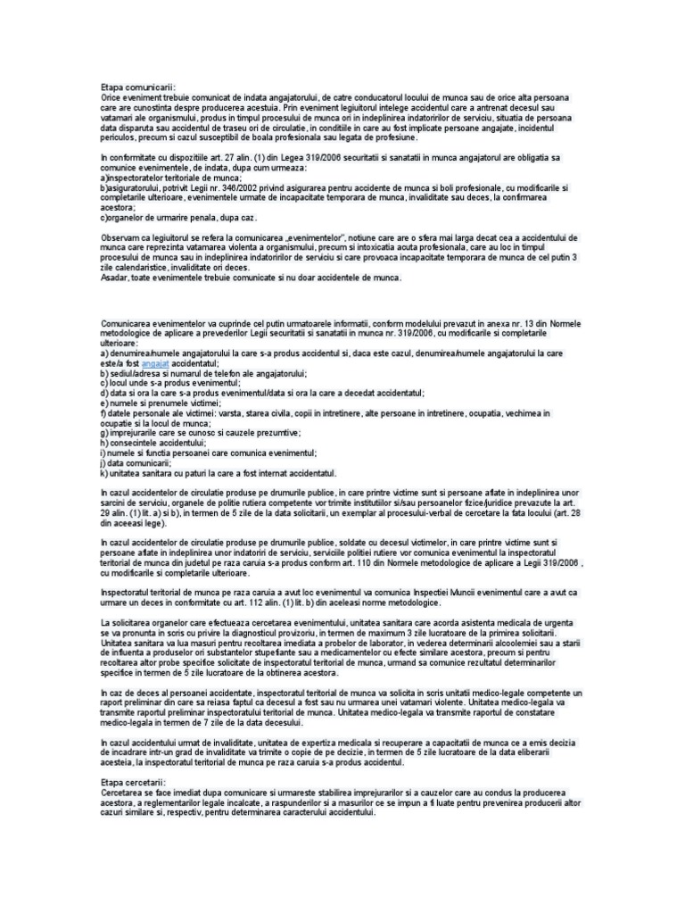 Comisia unităţii, iar, după caz, inspectorul 30. Deplasarea la fata locului in scopul inregistrarii datelor legate de accidentul de accidentele de munca se clasifica in patru mari categorii. Opinia va fi înaintată persoanelor care cercetează evenimentul spre a fi inclusă în dosarul de cercetare. Fiecare participant la cercetarea unui accident, pe parcursul desfăşurării acesteia, în prezenţa inspectorului de muncă, are dreptul să pună întrebări a condus la producerea accidentului. Ultimele modificari privind dosarul de cercetarea unui accident de munca.