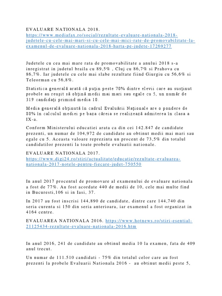 Pentru prima dată în procesul de evaluare a lucrărilor elaborate de candidaţii care susţin evaluarea naţională, comisia naţională de examen a decis ca acestea să fie corectate în centre zonale de evaluare din. Vineri, 1 iulie, ministerul educației publică lista cu rezultate evaluare națională 2016. 133 likes · 2 talking about this. Rata de promovare, pe judete, la evaluarea nationala 2016. Rezultatele repartizării computerizate pentru admiterea în liceu 2020 vor fi publicate azi pe admitere.edu.ro și edupedu.ro.