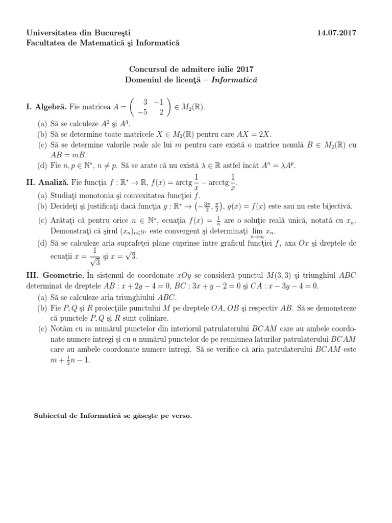 Actuala facultate de matematica si informatica (fmi) a universitatii din bucuresti este continuatoarea sectiei de matematica din cadrul în octombrie 1965 grigore c. Aveți mai jos subiectele și baremele de corectare (la disciplinele matematică și informatică) date la admitere la facultatea de matematică și informatică , universitatea bucurești în ultimii ani: Facultatea de matematică și informatică este o facultate a universității din bucurești.