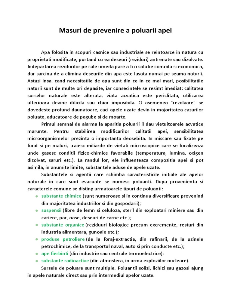 Mai jos poate fi vizualizat cuprinsul si un extras din document (aprox. Poluarea naturală se datorează surselor de poluare naturale şi se produce în urma interacţiei apei cu atmosfera, când are. Poluarea mediului inconjurator degradarea mediului sau poluarea cuprinde alterarea calitatilor mediului inconjurator, pâna la starea de incompatibilitate cu desfasurarea normala a procesului metabolic din organismele vii.