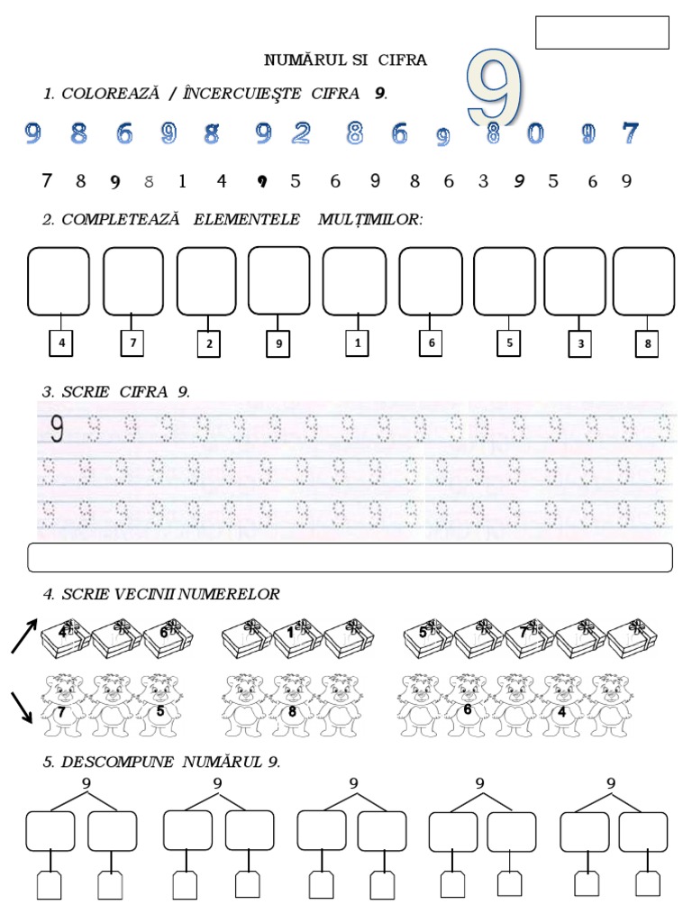 Fișa cuprinde exerciții variate de scriere a cifrei 7, de numărare și formare de mulțimi cu 7 elemente. Numărul şi cifra 9 tipul lecţiei: Să completeze cu numărul/cifra potrivită;